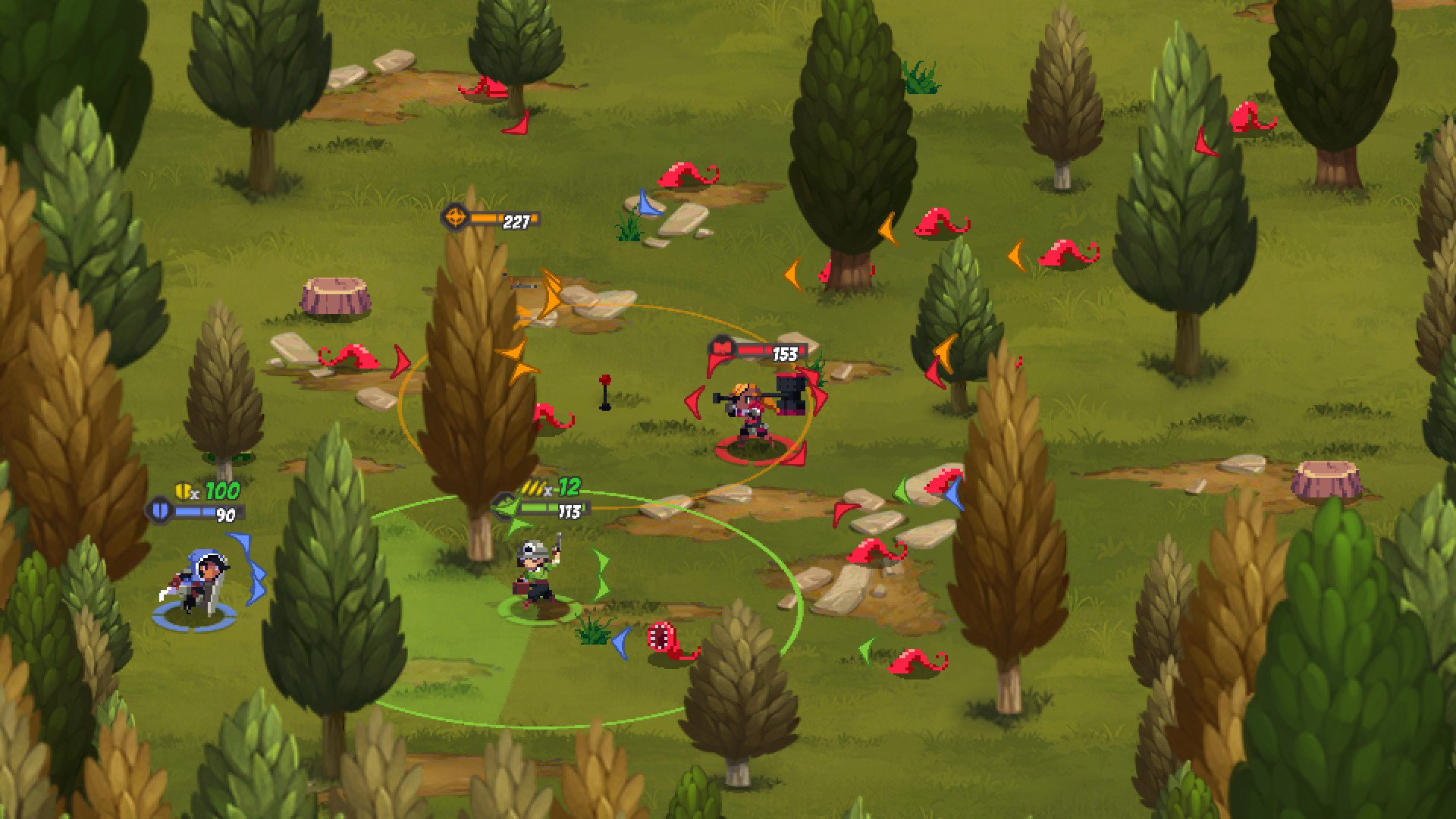 The game features a variety of play styles with four distinct classes: Alex the Friendly Fighter, who excels in close combat with counters and combos; Meg the Near-sighted Sniper, who can plant mines and attack from a distance; Triss the Boxy Tank, who protects allies with her shield and can send enemies flying; and Erin the Ovally Engineer, who controls the battlefield with turrets and firearms. Each class has its own unique skill tree, allowing players to experiment with different abilities and strategies.