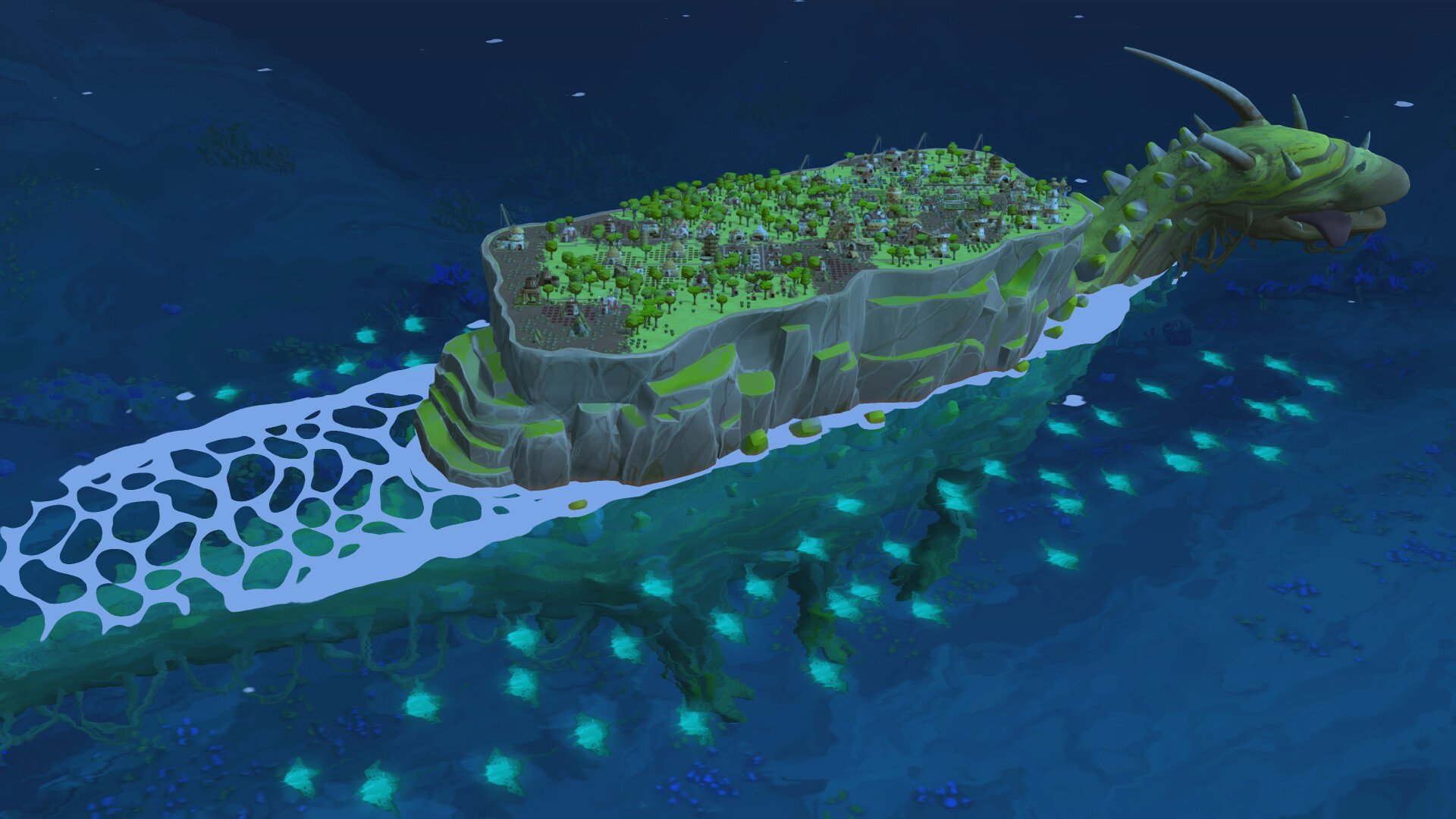 The Wandering Village is a unique city-builder set in a beautiful yet toxic post-apocalyptic world. After mysterious plants overrun the earth, a small band of survivors takes refuge on the back of a colossal, roaming creature called Onbu. As their leader, you must guide your villagers, expand their settlement atop this living titan, and forge a delicate symbiotic relationship to ensure both village and creature thrive.