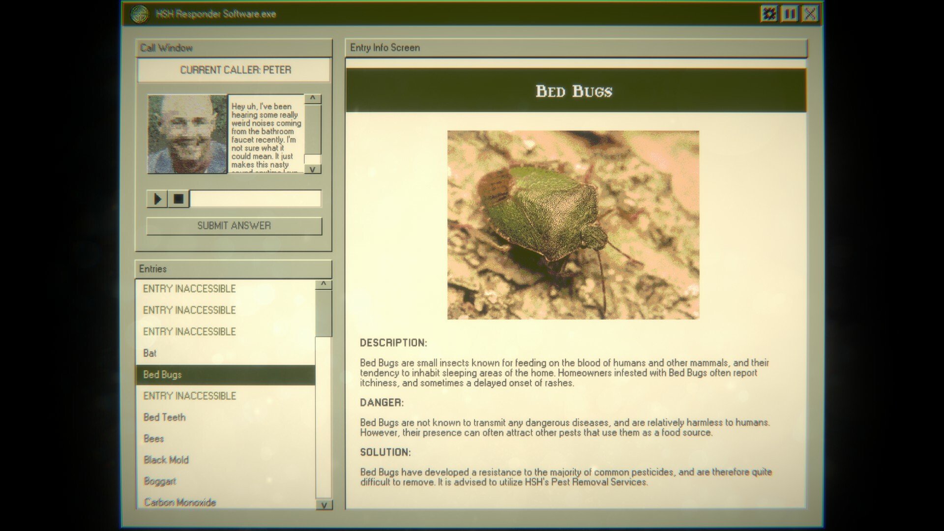 Using retro, 90’s-style technology, you delve into an extensive catalogue of home safety information, learning about all sorts of creepy infestations and dangerous anomalies. Your job is to interpret the clues in each call and determine exactly what threat might be hiding within the caller’s walls—any mistake could have dire consequences.