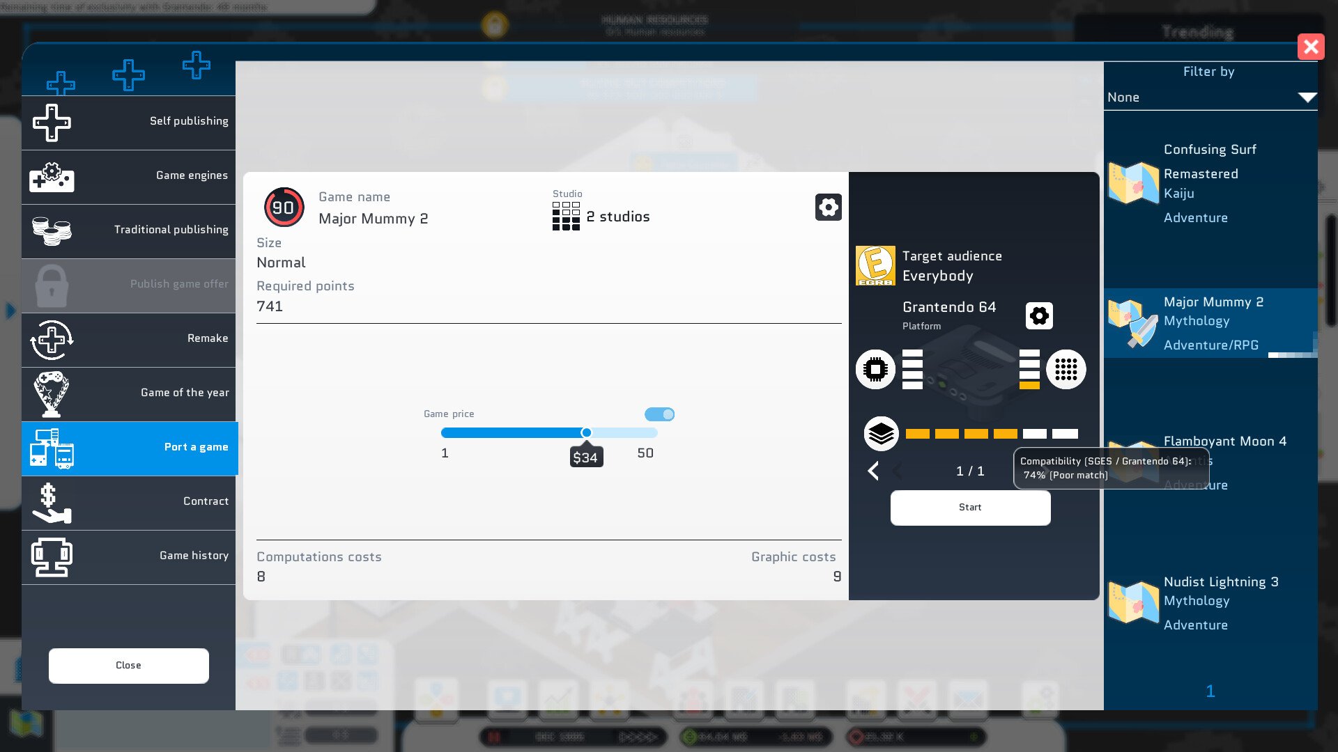 City Game Studio – is a deep management simulation that puts you in charge of your very own video game company right in the heart of a bustling city. Starting in January 1976 with just a tiny office, you quickly build your reputation by developing hit games and expanding your operations from a single studio to a network of creative teams. You’ll hire artists, developers, and testers; manage intricate schedules; and even tackle challenging marketing campaigns, all while navigating the complex world of game publishing and competition.
