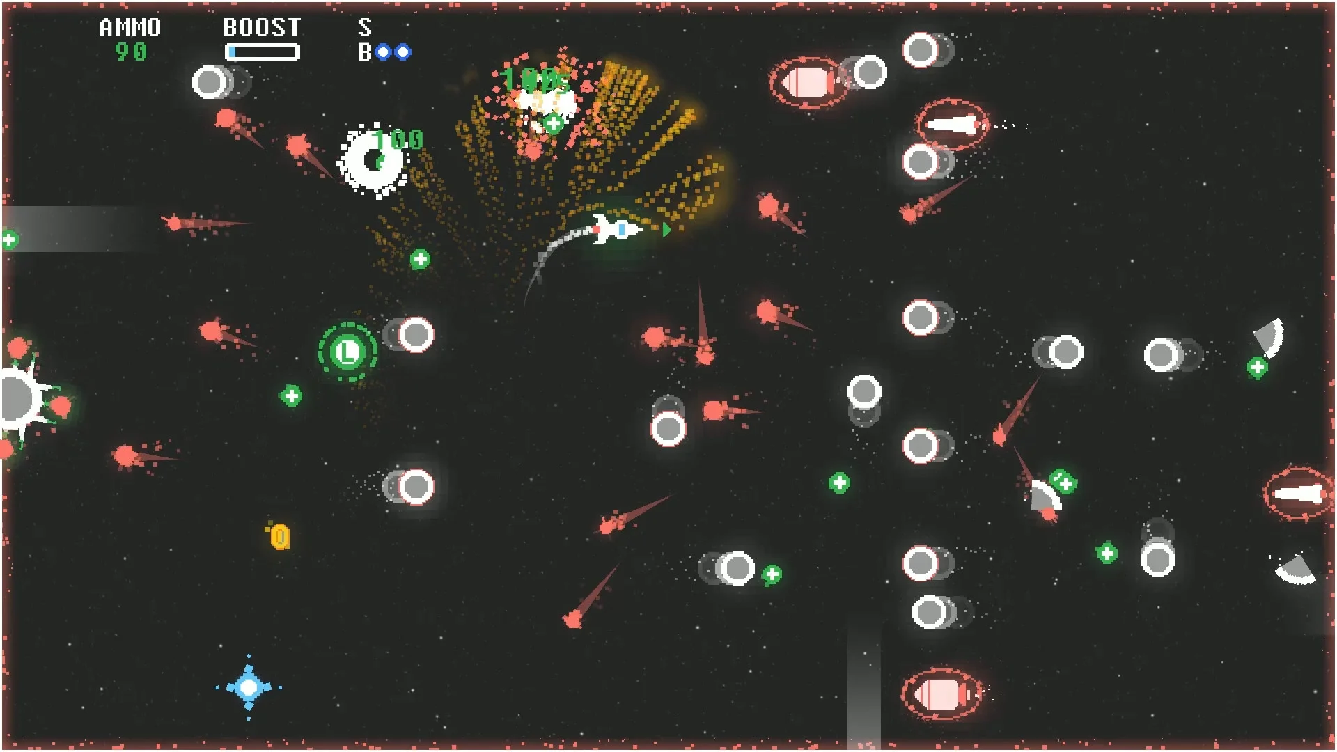 In Super Bit Blaster XL, your ship never stops moving and is constantly firing. This means you'll need to master turning, boosting, and braking to avoid the ever-growing swarm of enemies and obstacles. The gameplay focuses on quick reflexes and strategic use of power-ups. Pick up a variety of weapon upgrades—such as Spread Shot, Heat Seekers, Laser, and Blast Shot—as well as bombs to clear the screen, shields, and boost pickups to help extend your survival and rack up high scores.
