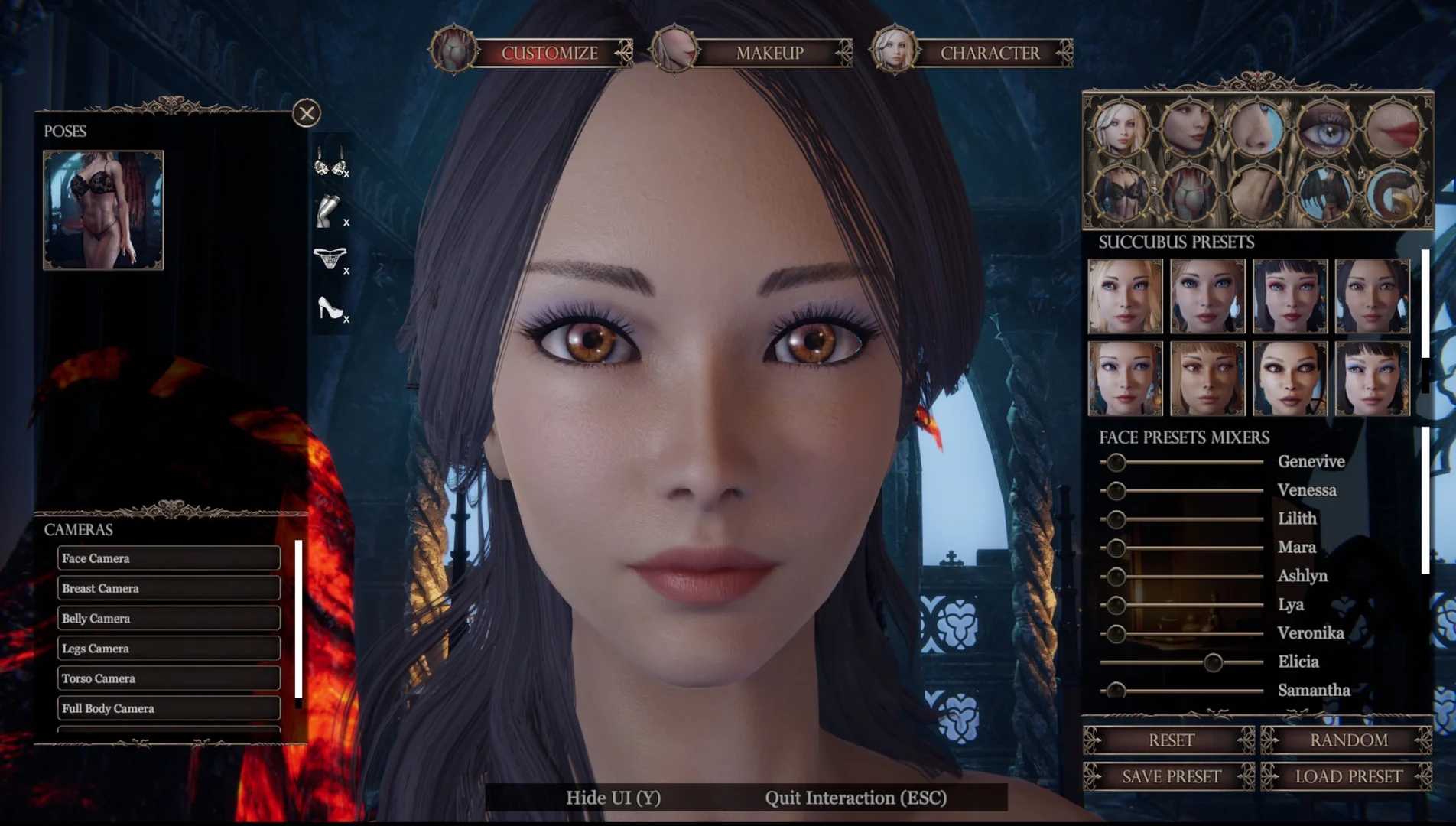 From the moment you enter the game you can fine‑tune every inch of your succubus. Dozens of facial sliders (eyes, nose, lips, jaw) combine with a full suite of body options (breast size and shape, waist width, muscle tone, skin complexion) so you can craft the exact demon queen you’ve always imagined. HD skin rendering even picks out veins and moles, while makeup and nail colors let you perfect her style.