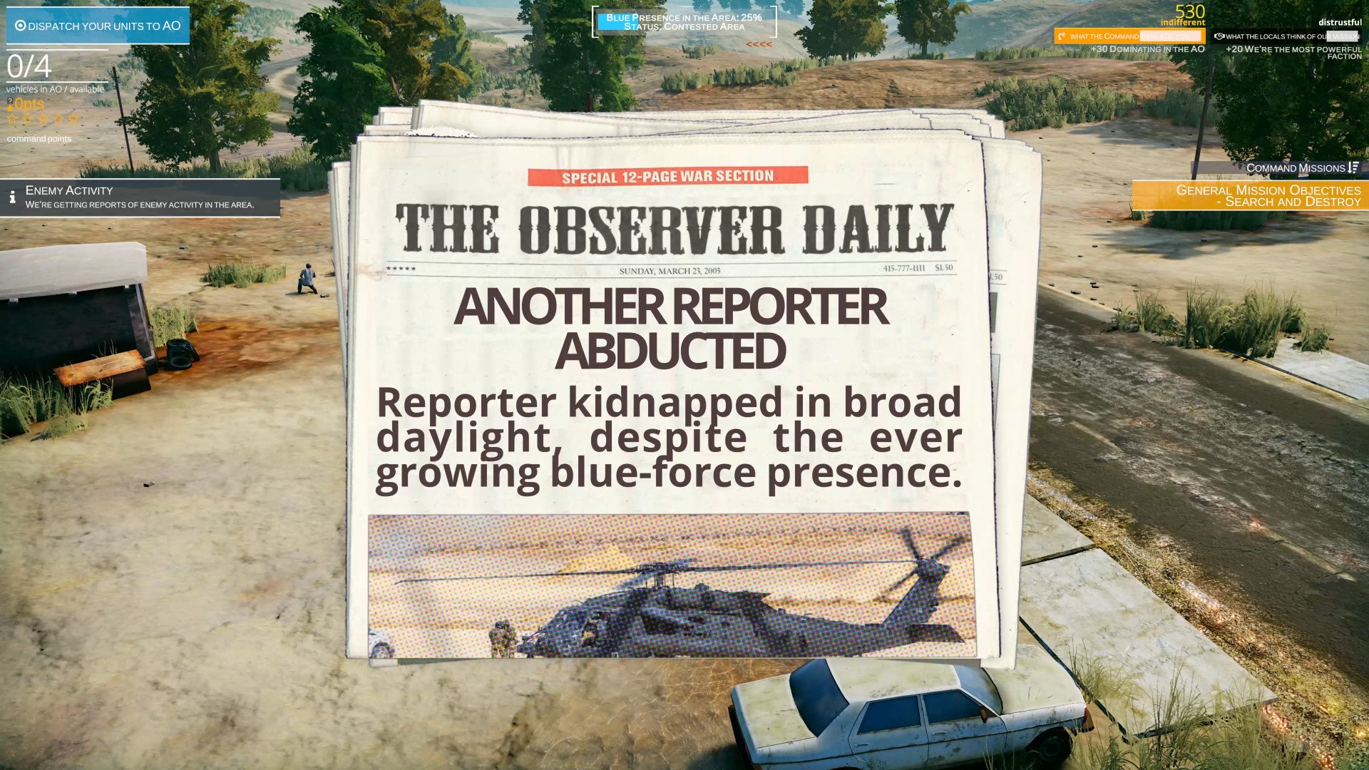 Mission: Winning the hearts and minds of the local population is crucial. You must push out criminal elements, neutralize opposition, and provide humanitarian aid to gain the trust of the locals who initially view you as invaders.