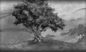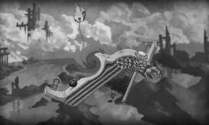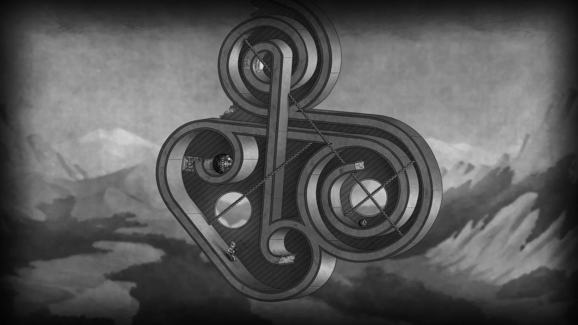 - Striking monochrome art styled like detailed lithographs, evoking Escher’s surreal architecture