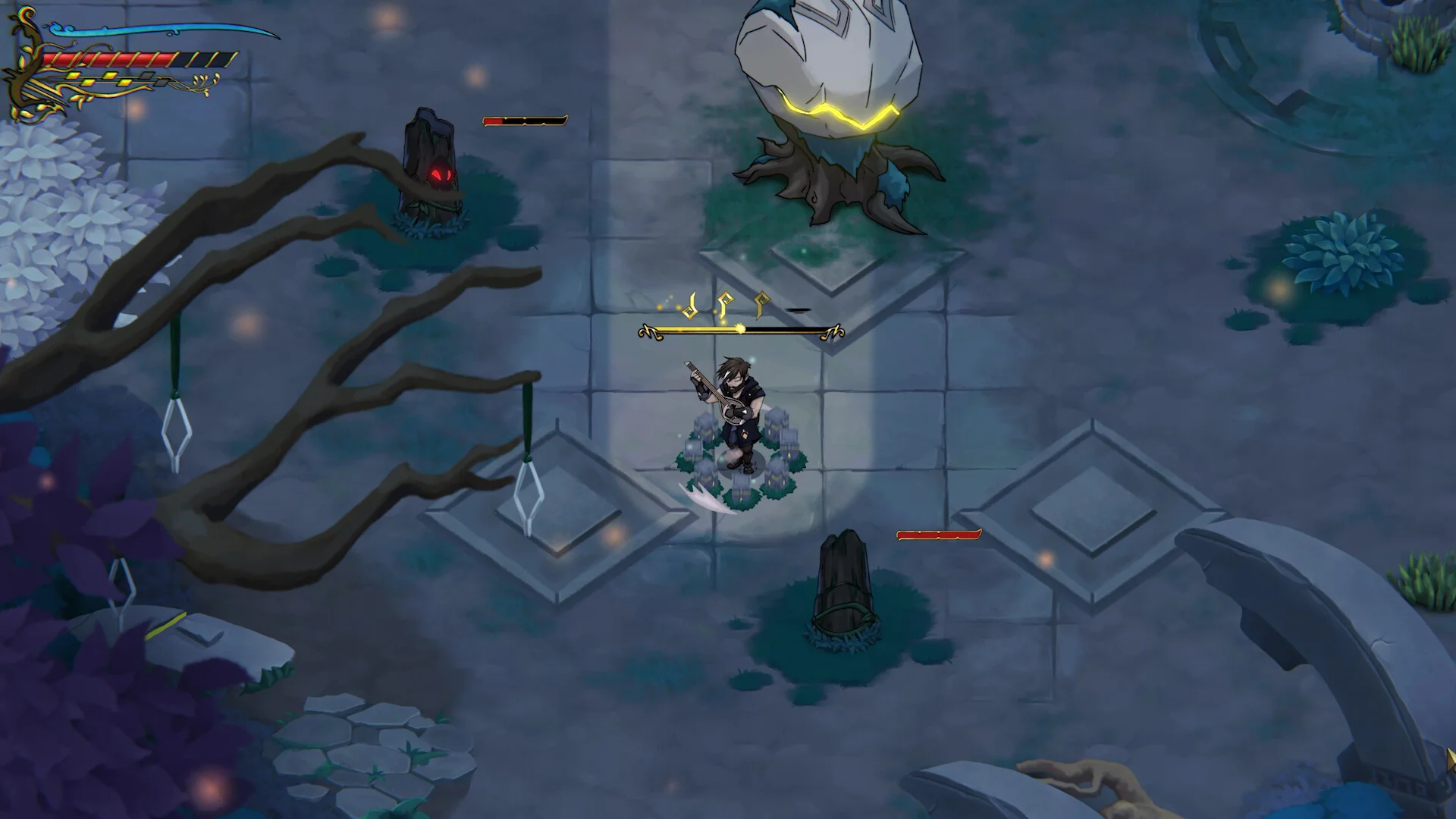 Beyond the battlefield lies an ancient woodland filled with hidden ruins, twisted abominations, and enigmatic totems. Traveler will encounter fellow adventurers-both human and robotic-each pursuing their own agendas. His mastery of song-spells lets him manipulate the environment, solving puzzles by growing vines, shifting platforms, or clearing debris with a single haunting chord.