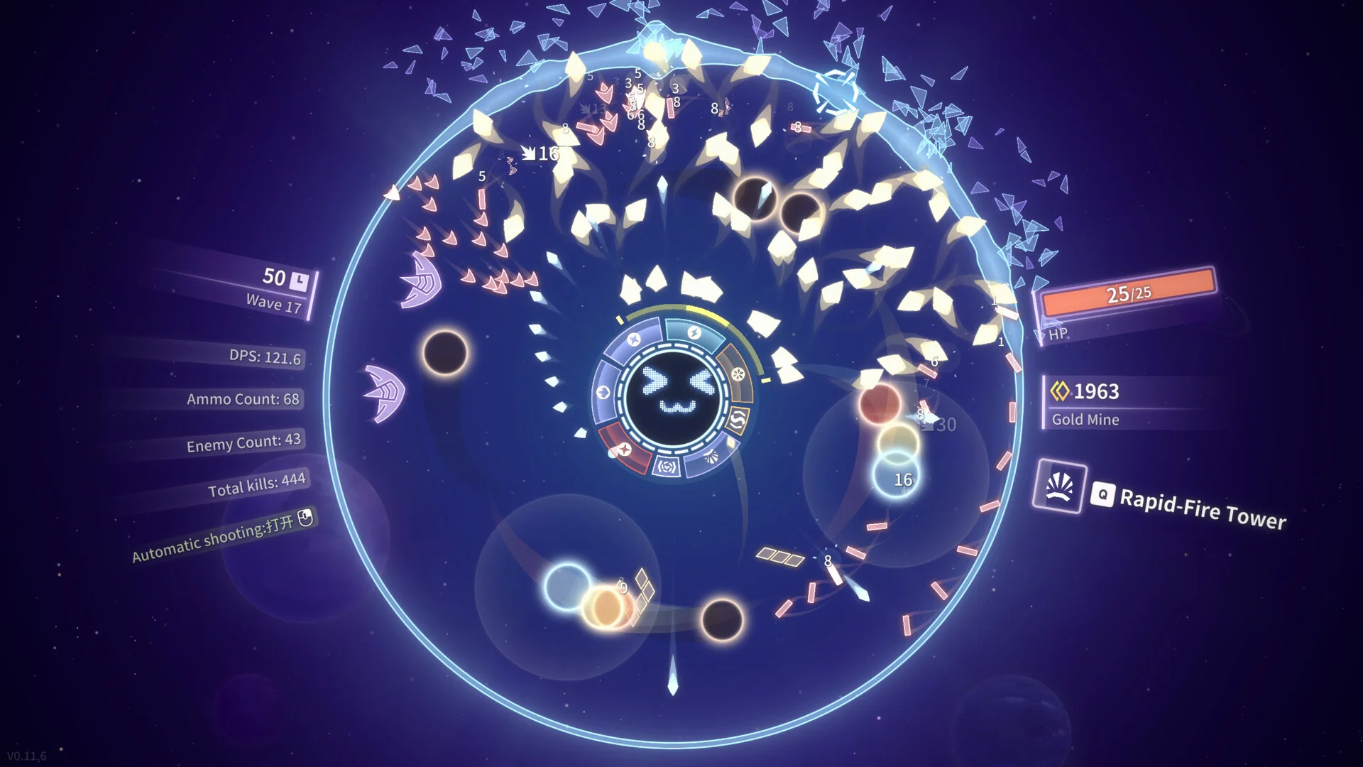 You take control of Earth's Super-Intelligence, using advanced technology to rain down unrelenting fire on incoming enemies. Build and customize a circular fortress, rotate it to aim at threats from any direction, and combine offensive and defensive modules to suit your playstyle. Destroy foes and mines, buy new components, and continually upgrade your setup as waves grow increasingly difficult.