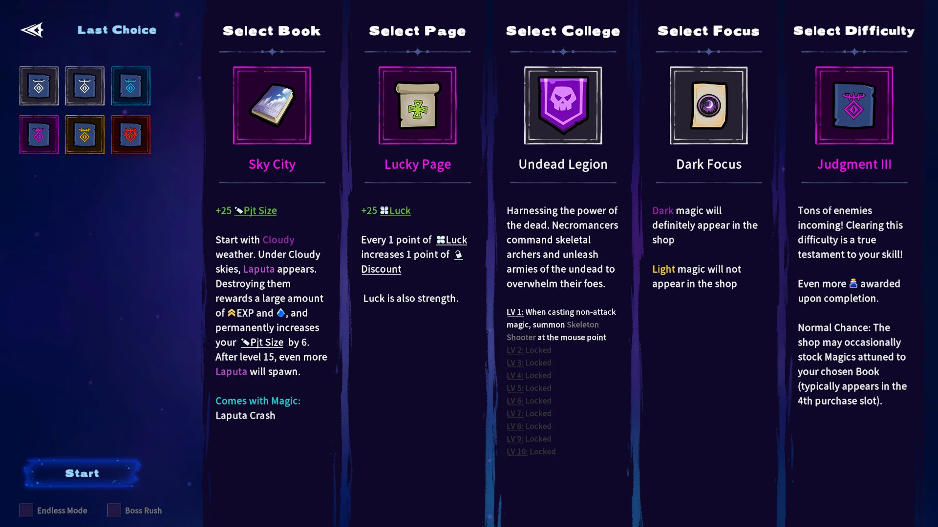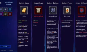 - Play as an awakened book with a lineup of thematic tomes (e.g., Bible magic, advanced mathematics, surreal titles).