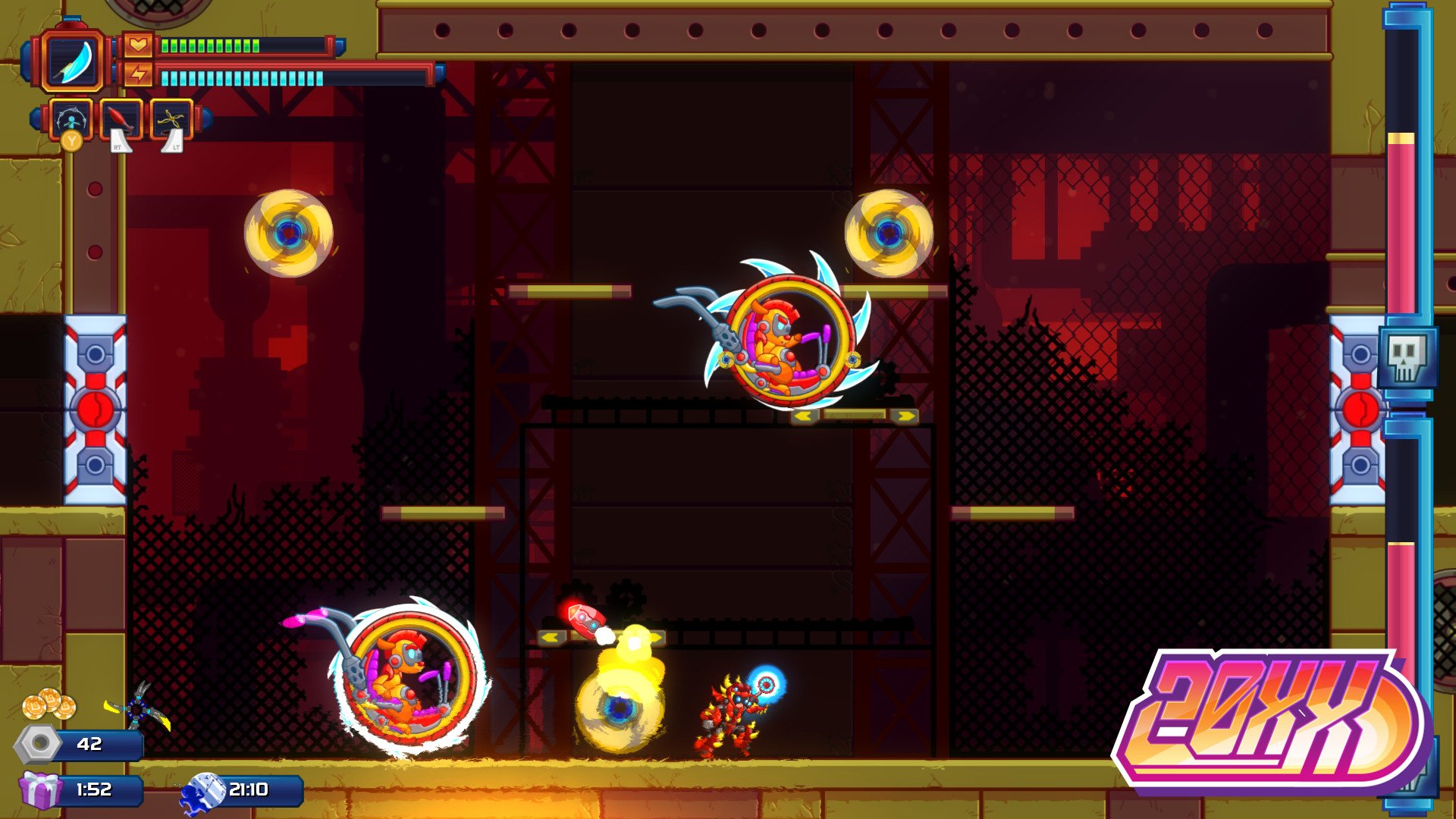 As a roguelike, 20XX features random levels, ensuring each playthrough offers a fresh experience. The game employs a permanent death mechanic, meaning each run is self-contained, and death will send you back to HQ. However, you can purchase upgrades for future runs. For those seeking a slightly less punishing experience, there's a Reverent Mode that grants you three lives per playthrough. As you progress, you'll earn Soul Chips, which unlock powerful permanent upgrades and expand the pool of items available during your runs.