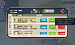 Gameplay is fast and often chaotic. Orders come through your in-game app and require quick prioritization; customers will cancel if you’re too slow, and repeated failures can get you fired. Shopping in first-person adds a tactile, frantic element as you hunt for specific products under time pressure. The balance between speed and precision is constant: wrong items, bad navigation, or sloppy deliveries cost both time and money. Between shifts, the apartment-upgrade system gives a tangible sense of progression and rewards your hustle with improved happiness and efficiency.