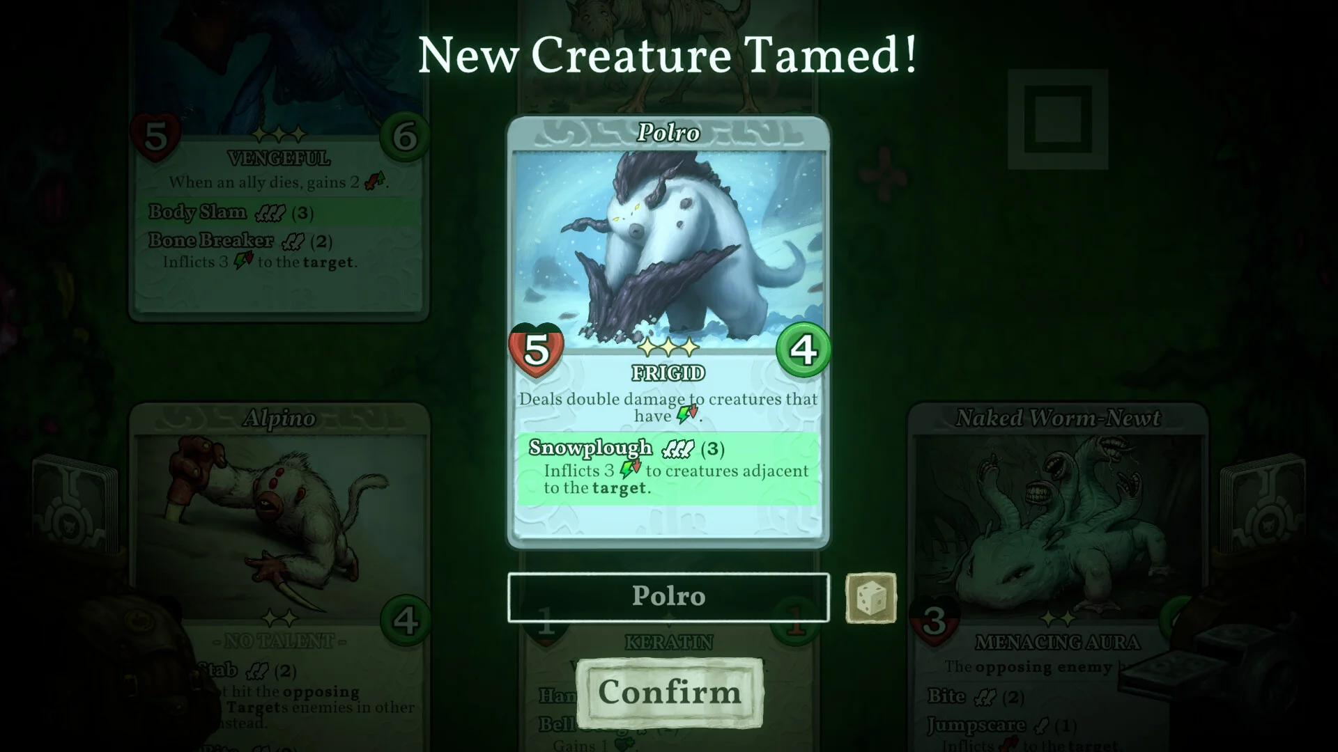 Instead of being handed new cards, you recruit foes by taming them and adding their cards to your squad. That makes every capture meaningful, because when one of your creatures falls in battle its card is permanently lost. Combat is turn-based and tactical: every card can perform a move each turn, so careful planning and sequencing are crucial if you want to win encounters.
