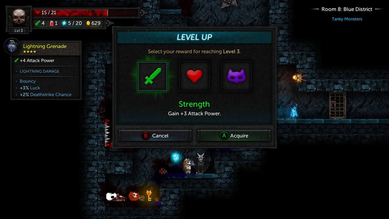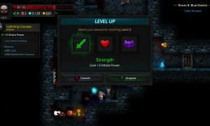 Combat leans on timing and weapon mastery-raise your shield, pick the right tool for the job, and learn each weapon’s quirks. Rooms, enemies, items and modifiers are procedurally generated, so no two runs feel the same. Difficulty ramps as you progress (more enemies per room), and deeper runs reward you with higher rarity loot and better item tiers. Healing options include potions, hearts found in rooms, or visiting Lady Tallowmere herself, and permanent unlocks expand your starting arsenal the farther you get.