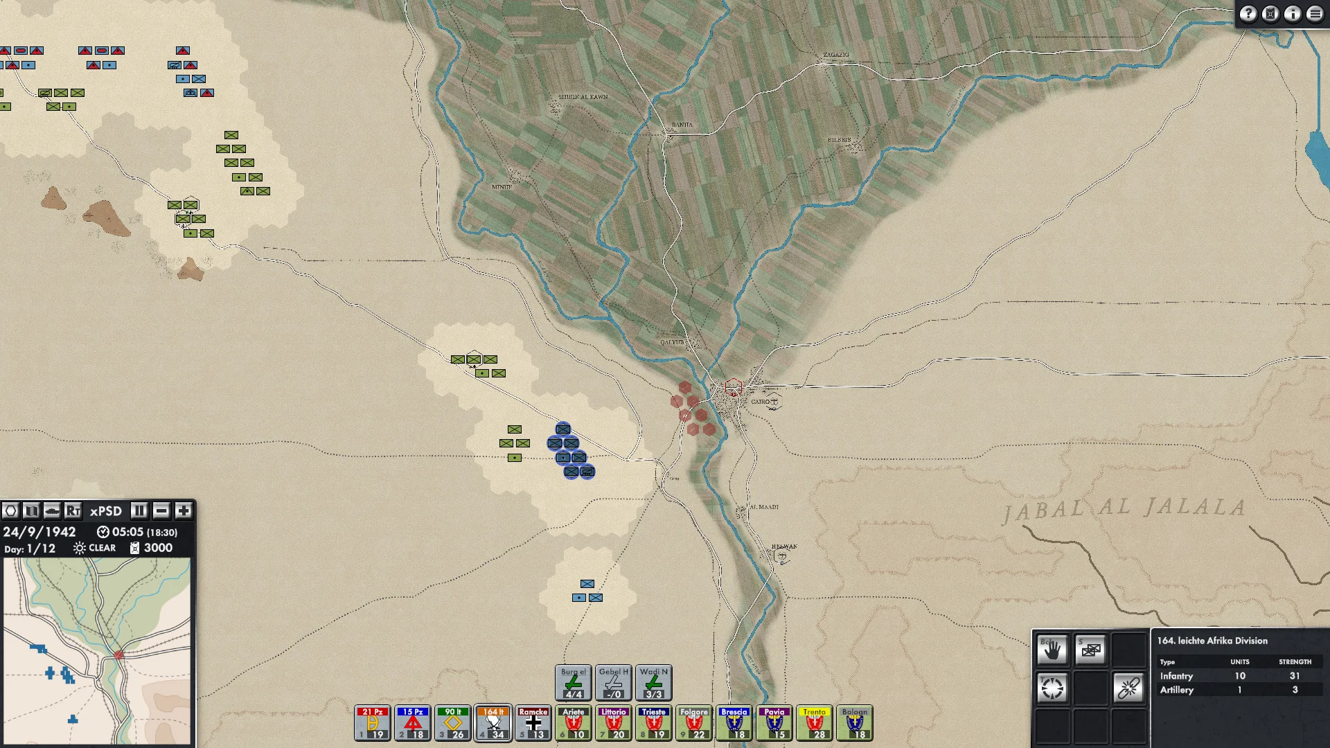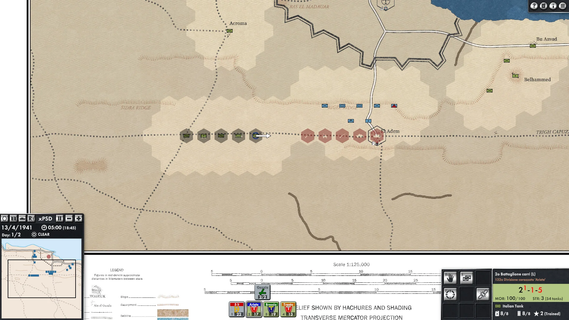 The interface is clean and user-friendly: maps and unit displays are uncluttered and easy to read, and you can choose between top-down models or traditional unit counters. Zoom out for full-battlefield situational awareness or zoom in for tactical decisions. The game map is enormous-nearly 2,000 kilometers from the Gulf of Sirte to the Suez Canal-featuring varied terrain such as sea, desert, mountains, wadis and ports, plus the long coastal Via Balbia and the desert tracks that lead into the Sahara. A built-in Scenario Editor lets you create your own battles anywhere on this vast battleground.
