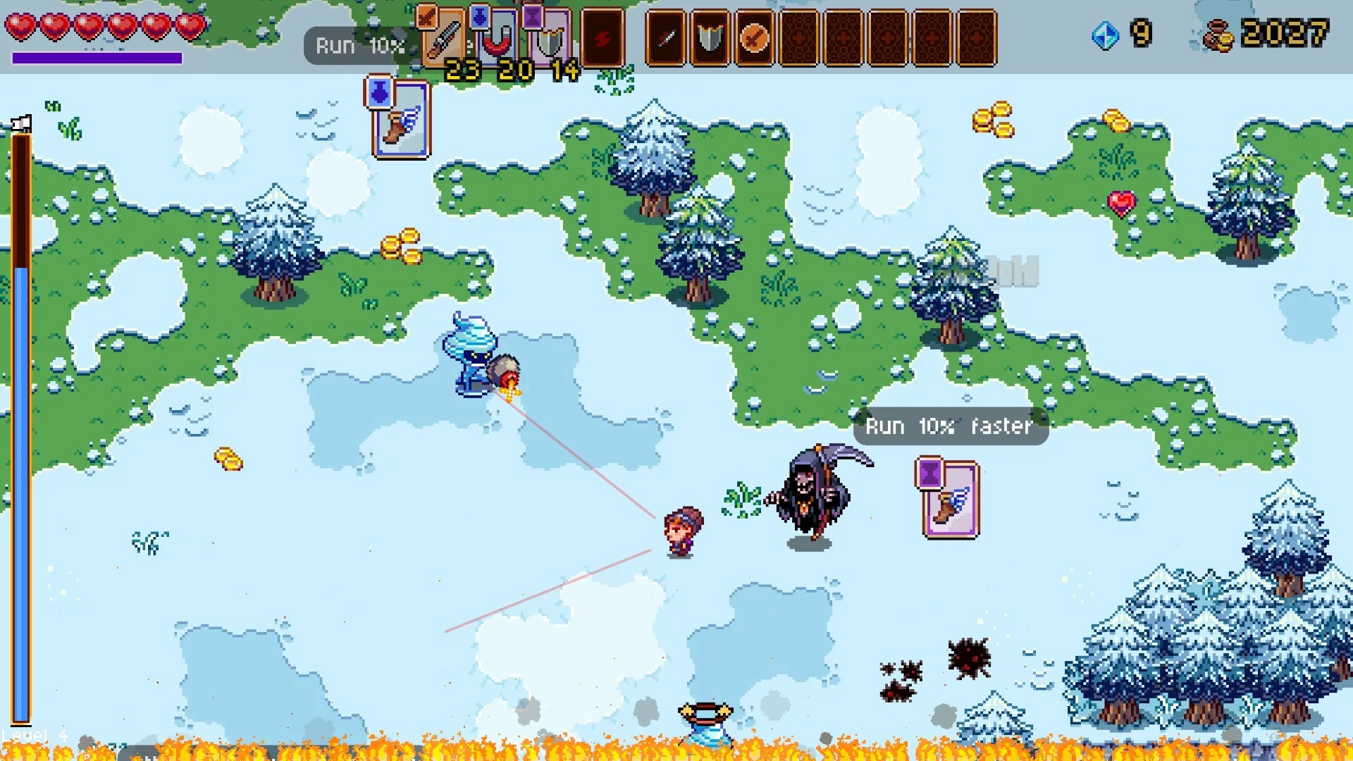 - Fights against quirky enemies and demonic bosses in a vertical sprint